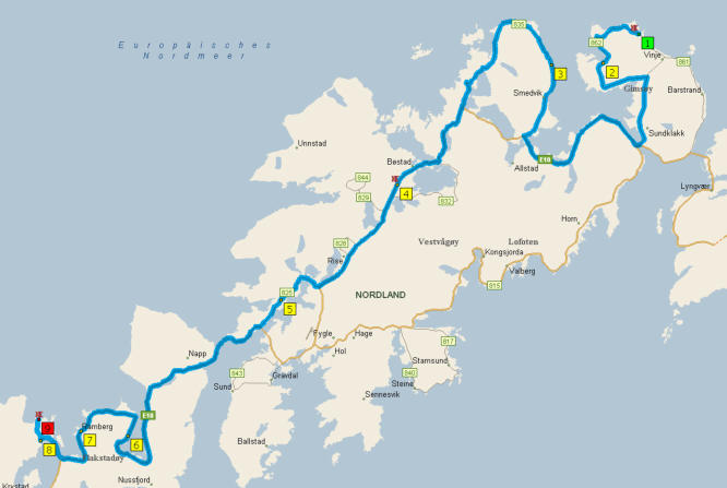 Fünfte Etappe : Hovsund nach Fredvang (101km, 1 Fähre)