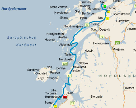 Neunte Etappe : Nesna bis Brønnøysund / Torghatten (132km, 3 Fähren)