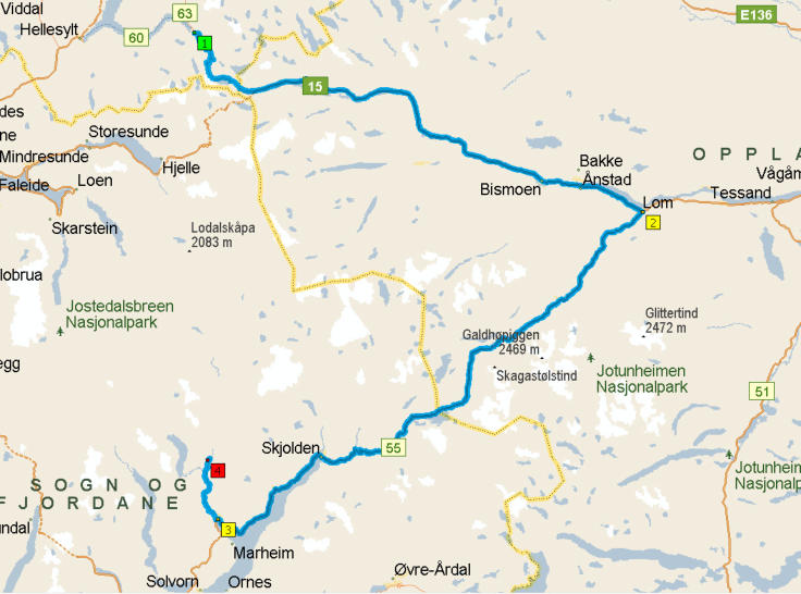 13. Etappe : Vom Geiranger Fjord bis kurz vor Jostedal (215km)
