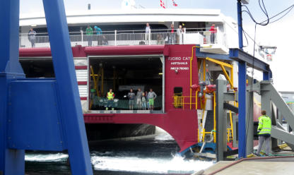auf ca. 70 Stundenkilometer. Aus den beiden Rümpfen des Katamarans schossen