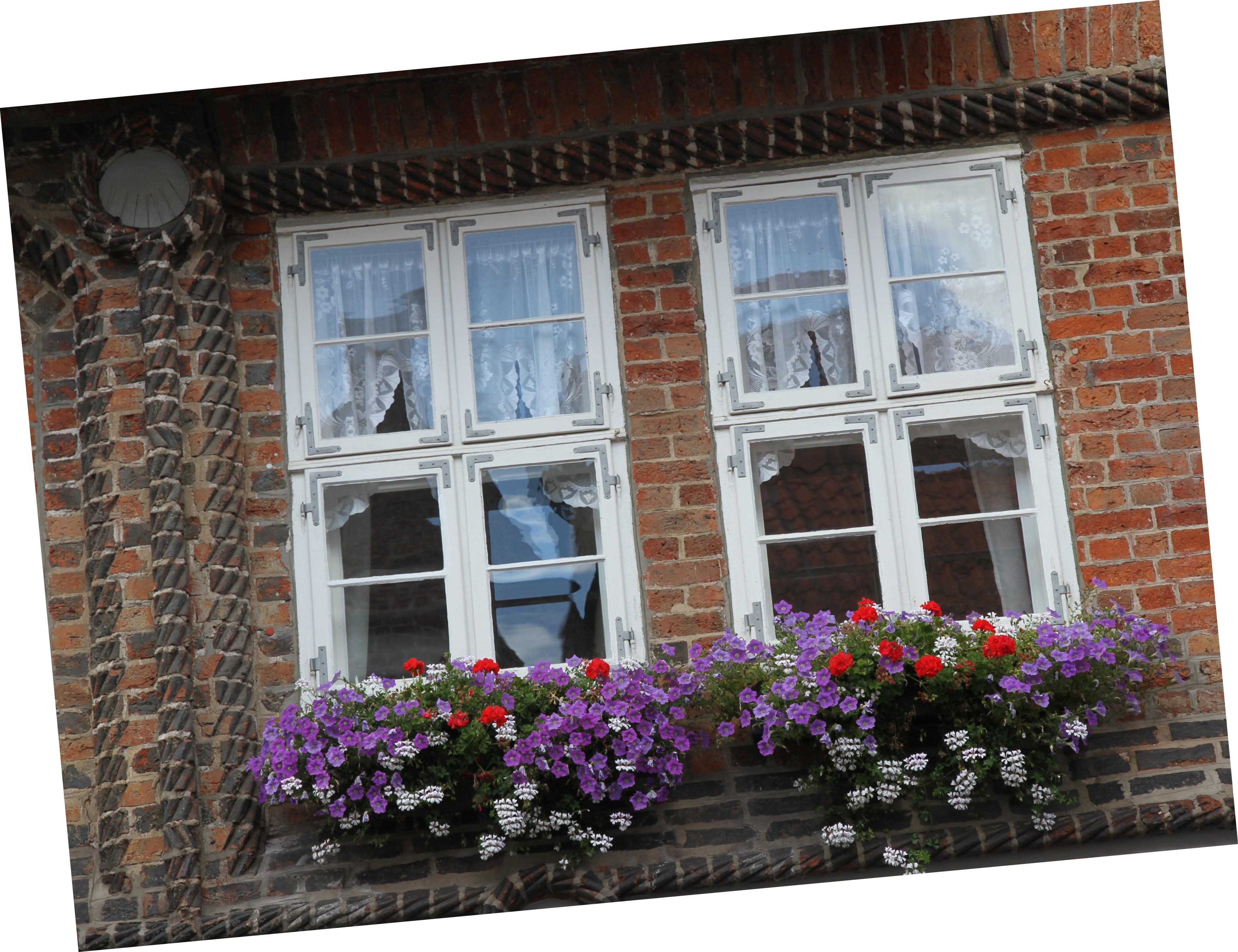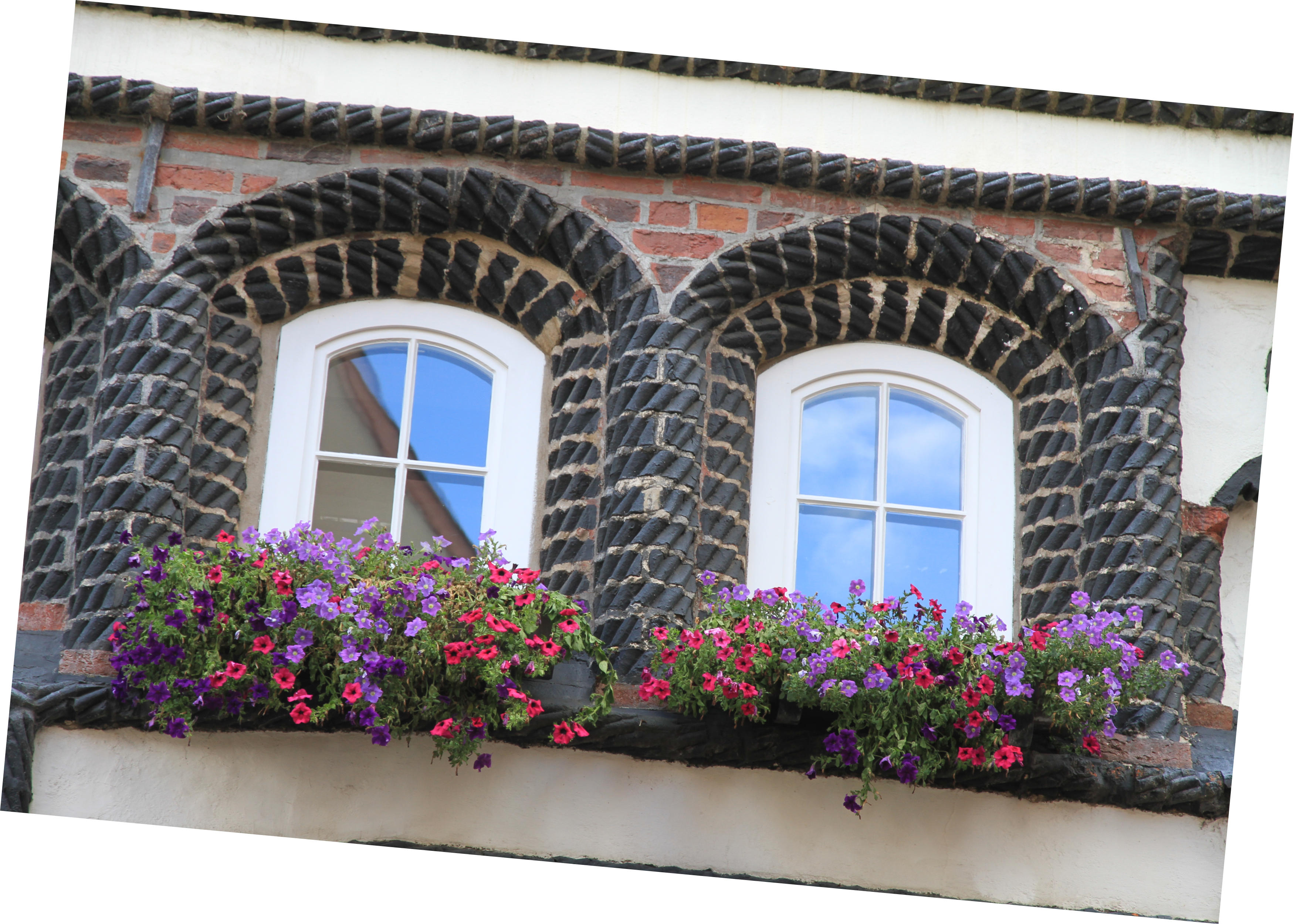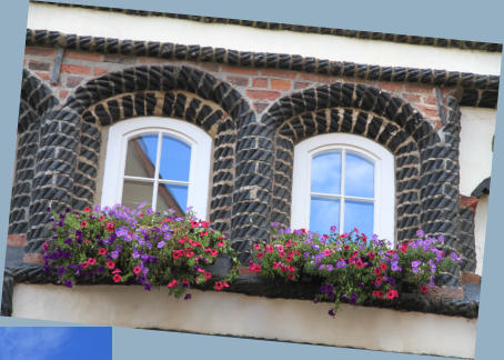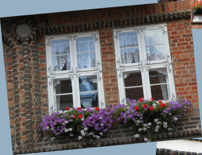 Die Blumenkästen an den Fenstern runden